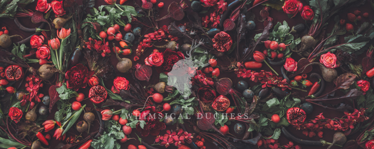 Deep ruby tones of beetroot, figs, pomegranates, and wild florals meet leafy greens and inky shadows in a visual feast that feels like a secret garden at midnight.
